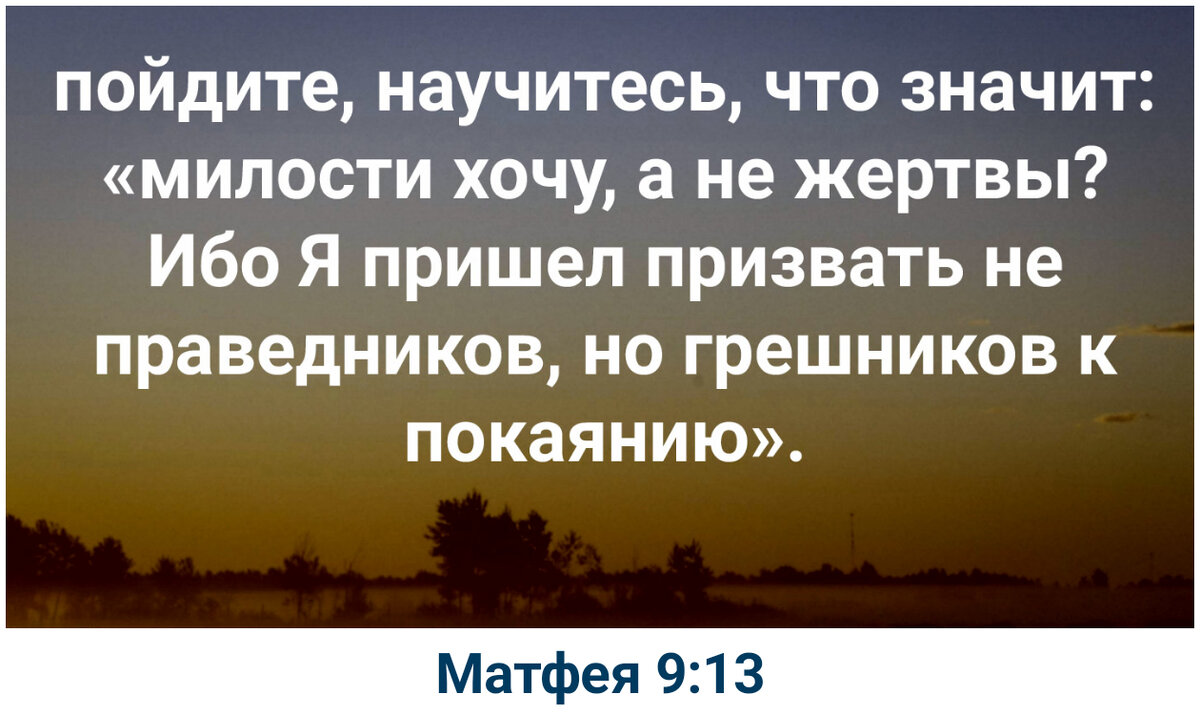 «И когда Иисус возлежал в доме, многие мытари и грешники пришли и возлегли с Ним и учениками Его. Увидев то, фарисеи сказали ученикам Его: для чего Учитель ваш ест и пьет с мытарями и грешниками? Иисус же, услышав это, сказал им: не здоровые имеют нужду во враче, но больные, пойдите, научитесь, что значит: «милости хочу, а не жертвы? Ибо Я пришел призвать не праведников, но грешников к покаянию».» (Матфея 9:10-13) Иисус Христос никогда не брезговал есть вместе с грешниками. Для религиозных лидеров Израиля это было неприемлемо, и они всячески пыталась осудить Иисуса. При этом фарисеи всегда использовали лукавую тактику: «не прямо говорили осуждающие слова, а обращались через кого-то». Иисусу жаловались на учеников, когда те срывали колосья пшеницы в субботу и ели их, а ученикам жаловались на Самого Господа. Целью такого лукавства было принести разделение между Христом и Его последователями. Ответ Господа всегда содержит в себе истину, которая предназначена для назидания в вере: «п