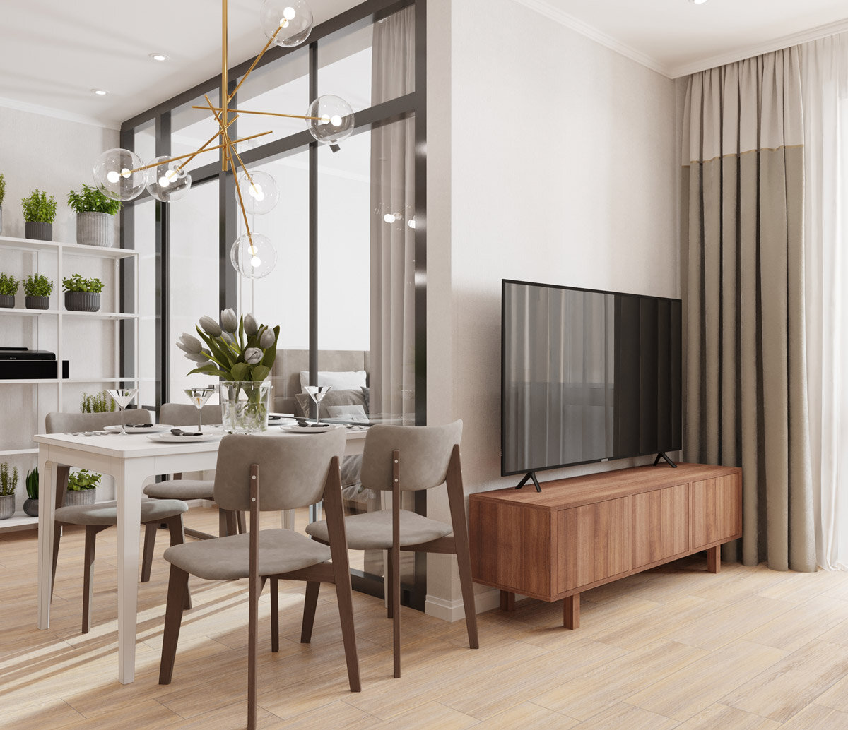 Поэтому современный дизайн квартиры хрущевки предполагает, что ее превратят в студию. Спальня и гостиная отделяются друг от друга непрозрачной стеклянной (например) перегородкой. Либо перегородка может быть прозрачной, но со стороны спальни закрывается блэкаутом. Вдоль линии окон оптимально размещать зоны гостиной, столовой и кухни, если позволяет планировка.