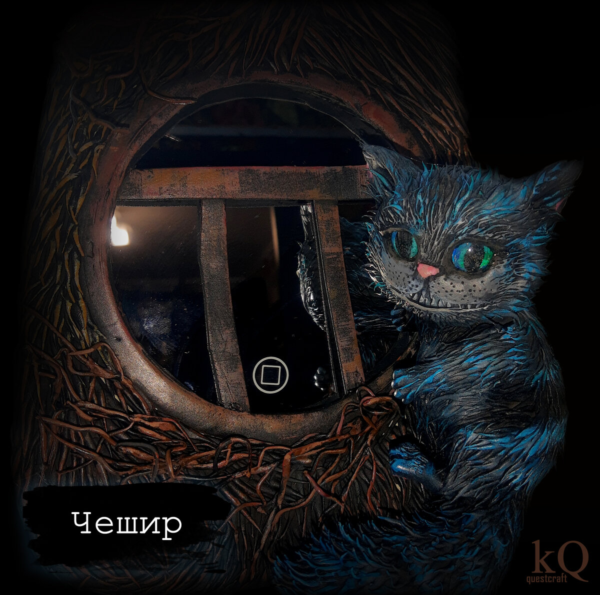 Сегодня хочу написать о идее декора зеркала foam пластиком, который отвердевает воздухе. Моя подруга любит "Алису в стране чудес" и также ей нравится Чешир, образ которого создал Тим Бертон. Я продумала принципиальный эскиз: декорировать зеркало под домик Шляпника, рядом с ним посадить Чешира. Я слепила отдельно фигурку Чешира: на основу из фольги нанесла пластик, затем добавила лапы, глаза (из кабошонов), мех из пластика. Сам по себе этот пластик немного мягкий на ощупь. Так что не смотря на его некоторую хрупкость, его интересно использовать для эффекта меха или хвороста: волоски мягкие, гнуться . Зеркало я купила круглое, с подсветкой. По форме домика Шляпника я вырезала пивной картон, декорировала пластиком. Теперь надо было закрепить Чешира. Я закрепила его на проволоку. Основной тон краски я нанесла аэрографом. Поскольку я использовала художественную акриловую краску, я ничем не заклеивала глаза, т.к. краска легко стирается. Далее покраска кистью)) В результате получился такой к