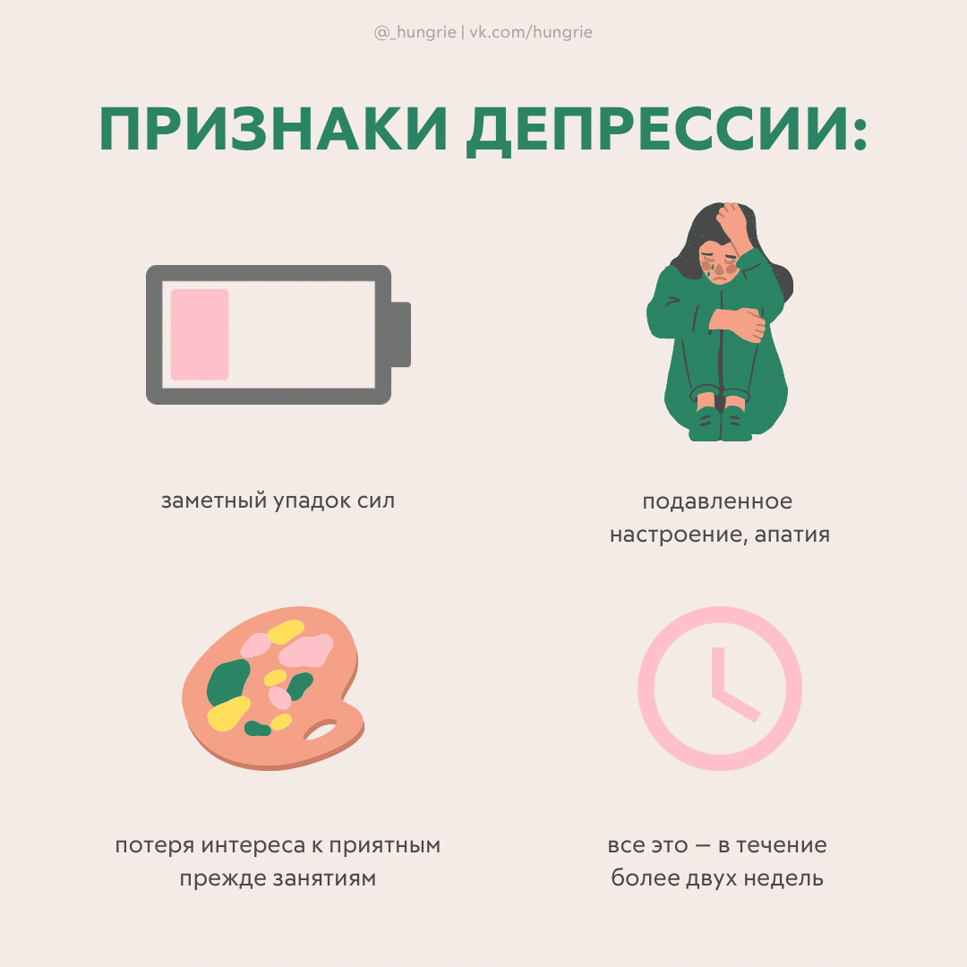 Грусть VS депрессия Когда в мире висит неопределённость, то мы можем испытывать целую палитру негатива. Однако, за ширмой обстоятельств может маскироваться не просто грусть, а депрессия. Вторым часто называют любое сниженное настроение. Однако эти понятия важно различать. В то время, как грусть — это нормальная реакция на происходящее, депрессия — заболевание, которое важно лечить. Печаль непродолжительна. В ней бывают просветы и она заканчивается, когда мы адаптируемся или обстоятельства исчерпывают себя. В отличии от неё, депрессия — это больше, чем плохое настроение. В МКБ-10 указаны следующие симптомы: 💧 Подавленное настроение в течение более двух недель; 💧 Потеря интереса к занятиям, которые приносили удовольствие раньше; 💧 Заметное снижение сил. Также человек с депрессией может испытывать нарушение сна, аппетита и внимания. Вся жизнь покрывается негативом. Будь то образ себя, своего будущего или окружающего мира: ✖️ Я никому не нужен. ✖️ У меня ничего не получается и не получи