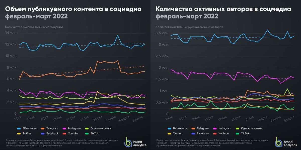 Вы можете удивиться, но исследования на эту тему уже есть. И их результаты поражают 👇🏻 Платформа Brand Analytics собирала данные активности пользователей соцсетей в период с 1 по 10 марта аккурат перед первыми слухами о блокировке Instagram в России. 🧐 Куда «мигрируют» пользователи Meta? Какая аудитория образуется на площадках, принимающих «мигрантов»? На динамику публичного русскоязычного контента в различных платформах и динамику числа активных русскоязычных авторов вы можете посмотреть ниже, а пока давайте разберёмся в данных инфографики. — Активность авторов Итак, число активных авторов за день — это авторы (не боты), которые опубликовали в исследуемый день хотя бы одно сообщение, комментарий или репост. В лидерах по числу авторов с большим перевесом и трендом на рост — «ВКонтакте». На второй позиции уже с отрицательным трендом — Instagram. Третий — Telegram. — Объём публикуемого контента «ВКонтакте» стал лидером и здесь. Платформа показала положительный тренд не только по автор