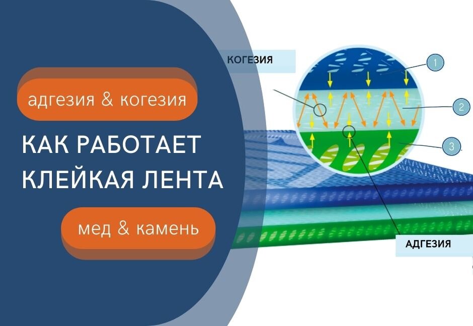 Мед имеет высокую адгезию — он сразу же приклеивается к поверхности. Но когезия у него слабая, поэтому он растекается по поверхности под воздействием собственного веса. Точная противоположность — это камень. У него высокая внутренняя прочность, когезия, но у него никакая адгезия, поэтому он не клеится к поверхностям.