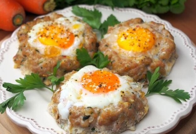 Мясные гнездышки с куриными яйцами – котлеты, запеченные в духовке