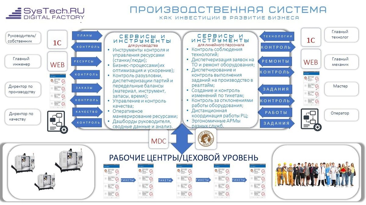 Так выглядит общая схема управления производственной системой и замкнутый контур о котором мы говорили ранее. Здесь и руководство, и линейный персонал, и станки, и контролеры с ручным вводом информации, и информация, поступающая с тех же станков автоматически через системы мониторинга ЧПУ. Каждый инструмент или сервис в той или иной мере требуется каждому предприятию, но именно в текущий момент времени эта потребность разная и главное разный эффект от его запуска и использования. И в этом смысле подход матрично-сетевой автоматизации дает возможность расставить приоритеты и получать отдачу сразу. Видя ее эффективность вкладывать ресурсы в дальнейшее развитие - это будут не расходы на цифровизацию, а инвестиции в цифровизацию, развитие и управляемость бизнеса! В этой системе мы предусматриваем и прописываем для каждой роли, свои параметры, которые он выдает в систему, какие контрольные точки получает из нее, каким методом и инструментами обменивается с системой и между другими роля