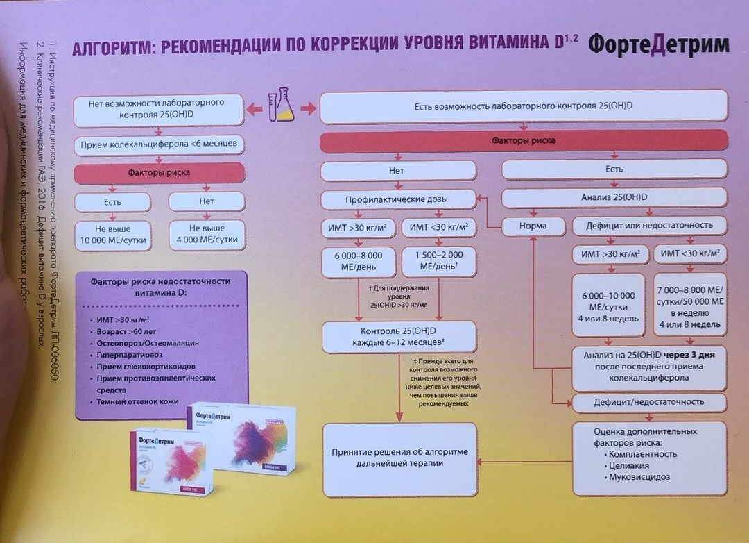 В конце февраля на одной конференции для терапевтов увидела вот такую чудненькую схемку для лечения и профилактики дефицита витамина Д: Казалось бы, что тут занимательного? Конференция бесплатная - реклама обычное дело. Деньги же нужно как-то зарабатывать, да и препарат хороший. Не осуждаю. Но. Но меня зацепил момент с дозами при ожирении и других факторах риска. Обычно я б подумала, что Я чего-то не знаю или забыла… Но буквально за день до этого перечитывала новые клинические рекомендации от 2021 года. 📎В рекламной раскладке: профилактическая доза 6000-8000 МЕ/сут лечебная доза 6000-10000 МЕ/сут 📎В рекомендациях 2021г: профилактическая доза 3000-6000 МЕ/сут лечебная доза 14000-21000 МЕ/сут Немножко отличается, да? Тут, даже если отвлечься от официальных данных… Не смущает, что профилактическая доза и лечебная почти одинаковые? Да и откуда взяты эти цифры? На брашурке, которую любезно предоставил фармпред, есть ссылки на инструкцию к препарату и клинические рекомендации 16 года (а он
