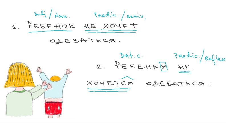 Смысловые отношения внутри предложения в каждом языке имеют свои особенности. Ошибки иностранцев при построении русских безличных предложений часто связаны с тем, что грамматический строй этих конструкций отличается от привычных. Здесь один главный член в различных формах выражения (например, личный глагол в безличной форме), субъект в косвенном падеже, а также другие особенности. Кроме того сложности возникают, если в родном языке безличных конструкций нет или они строятся по другим правилам. Давайте рассмотрим, по каким схемам строятся русские безличные предложения. Сегодня займемся предложениями с возвратными глаголами и наречиями. В безличных предложениях действия или состояния совершаются без действующего лица. Давайте сравним два предложения: “Ребёнок не хочет одеваться” и “Ребёнку не хочется одеваться”. В первом предложении у нас есть субъект в именительном падеже и предикат. Это активная конструкция. Во втором предложении есть предикат, выраженный возвратным глаголом с постфикс