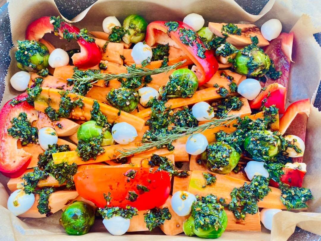 Запечённые овощи с сыром Моцарелла и соусом из морковной ботвы