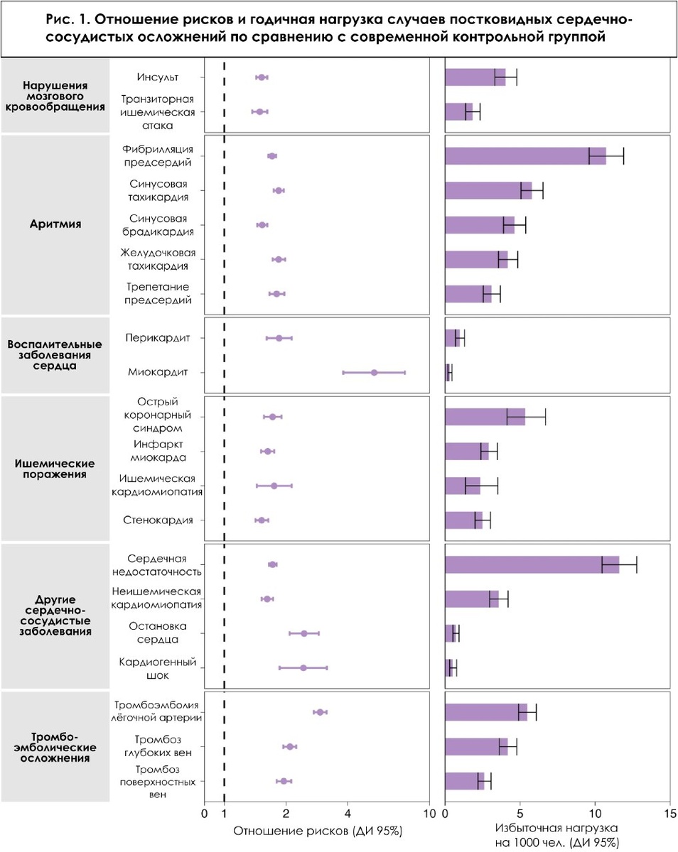 Почему эти данные настолько особенные, что их разбирали наиболее авторитетные научные журналы, включая Nature, Science и British Medical Journal? Величина исследования. Это первое очень крупное исследование, изучающее сердечно-сосудистые последствия COVID-19 с участием 11 млн человек. Распространённость осложнений. Риск сердечно-сосудистых осложнений повышается даже у молодых людей с лёгкой COVID-19, у которых не было ожирения, фоновых болезней и предрасположенности к сердечно-сосудистым заболеваниям. Осложнение затрагивает людей разной расы, возраста, пола, c различными заболеваниями или их отсутствием, c различной тяжестью инфекции. Длительность осложнений. Сердечно-сосудистые последствия изучались спустя 1 год после случая заражения SARS-СoV-2. Количество осложнений. Выявлено 20 различных заболеваний сердца и сосудов. Исследование опубликовано 7 февраля 2022 года в журнале Nature Medicine [1], разберём подробности и результаты. До него сердечно-сосудистые симптомы при постковидном