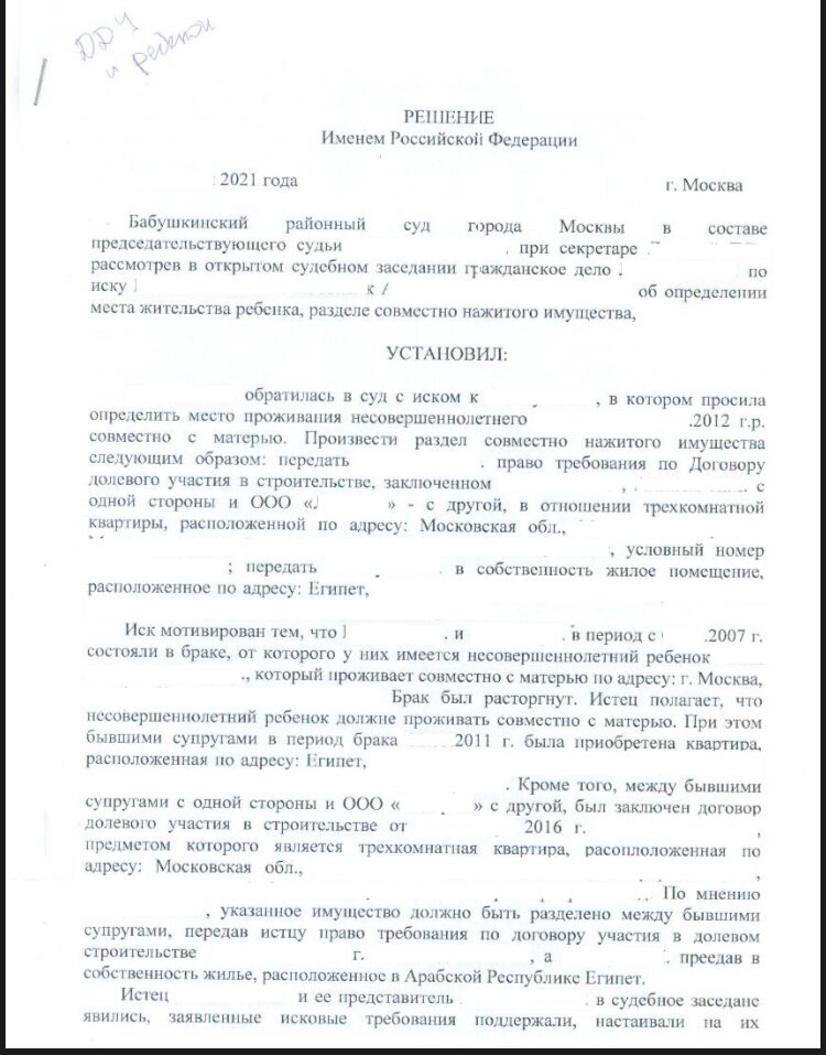 Последнее время наблюдается тенденция при которой большинство браков распадается, так согласно официальным данным из Росстата количество разводов в 2020 году составило 457409, а в 2021 году заметно увеличилось и составило 537880. Многие супружеские пары не всегда могут прийти к мирному разводу (за исключением тех случаев, когда суд обязателен) и приходится обращаться в суд. В этой статье мы разберем один из таких случаев (имена будут заменены). Обратившись к нам за помощью гражданин Матвеев (который на момент развода находился в США), узнал о разводе спустя 5 месяцев. Наш доверитель был не согласен с требованиями исковых заявлений своей супруги. В период брака супруги приобрели право аренды на недвижимое имущество в Египте сроком на 99 лет (в нотариальном переводе, договор фигурировал, как «договор купили продажи»), а также была приобретена квартира в Московской области. Гражданка Иванова в своем исковом заявлении требовала: - передать ей право требования по ДДУ