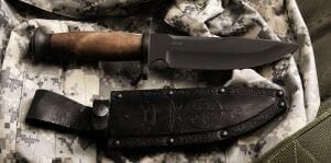 Ножи ДВ-1 и ДВ-2, отличающиеся только длиной клинка, разработаны по заказу и в сотрудничестве с бойцами дальневосточного спецназа. Об этом говорят и их названия – ДВ значит «дальневосточный». Это массивные кемпинговые ножи, способные выдержать большую нагрузку и применяться для самых тяжелых работ. На фото выше представлен нож ДВ-1 с копьевидным клинком и дополнительной заточкой на обухе. Рукоять ножа выполнена из кавказского ореха, стальная гарда и навершие из того же материала. У ножа ДВ-1 цельнометаллический хвостовик, проходящий сквозь рукоять, винтовая сборка и кожаные ножны. На фото приведен экспортный вариант ножа ДВ-2 из ограниченного выпуска, отличается от своего серийного прародителя применяемыми материалами. Его клинок изготовлен из стали Z60 вместо обычной для этих ножей углеродистой стали 50Х14МФ, а рукоять ножа может быть выполнена наборной из кожи, тогда как у базового варианта она только из ореха. При первом же взгляде нож производит впечатление своими размерами. Его по