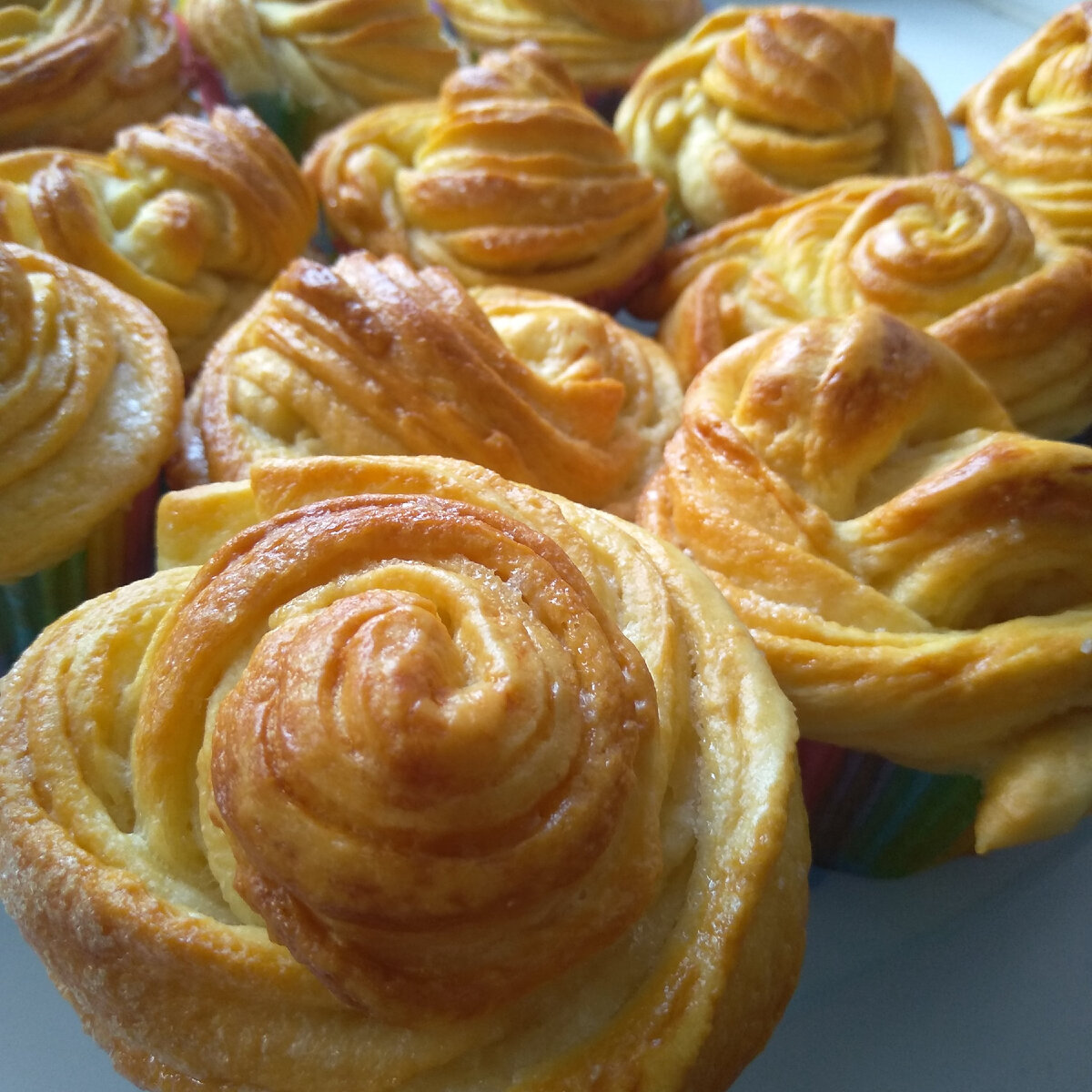 Сегодня хочу вам рассказать об интересном рецепте. Краффины это гибрид куассана и маффина. Делается из любого дрожжевого сдобного теста. Хрустящие и сахарные снаружи и мягкие пушистые внутри. У меня дрожжевое тесто на кефире. ингредиенты: кефир 250 молоко 250 дрожжи свежие 50 гр или сухие 14 гр сахар 4 ст.л. соль 1 ч.л. яйцо 1 шт. (белок в тесто желток для смазки) растительное масло 12 ст.л. мука 1 кг Ванилин 1 пакет Приготовление: Вылить в миску кефир и молоко, добавить дрожжи соль, сахар, яйцо (белок), масло 10 ст.л, ванилин. Размешать. Муку просеять, добавить в кефирную молочную смесь. Замесить тесто, в конце добавить 2 ст.л. масла. Накрыть миску полотенцем или пленкой. Поставить тесто в теплое место на 1 час. Тесто разделить на 32 части. Раскатать каждую часть очень тонко. Смазать растительным маслом (можно растопленным сливочным, хуже не будет))) и щедро посыпать сахаром. Скатать в трубочку. Трубочку разрезать пополам вдоль, почти до конца. Из полученной змейки свернуть улитку