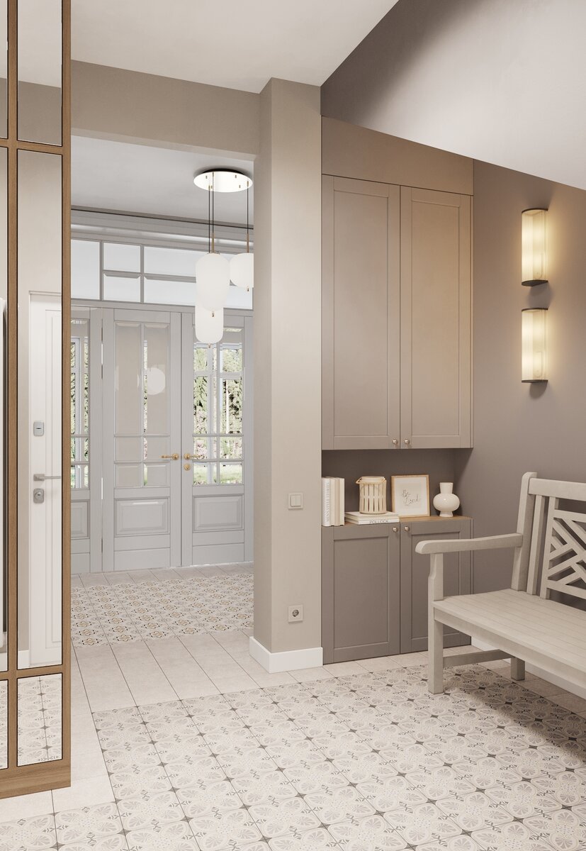 проект №057 | 2021 Интерьер этого дома построен на нюансном сочетании фактур и оттенков серо-бежевого цвета. И он, скорее, служит фоном для яркой семьи, которая будет в нём жить. Прихожая и лестничный холл Небольшая прихожая радушно встречает гостей, приглашая неспешно снять верхнюю одежду и обувь и пройти в холл, из которого сквозь остекление двери в гостиную загадочно проглядывает вид на лес. Кухня-столовая В этом проекте кухня без верхних модулей. Площадь позволяет уместить всю необходимую утварь в нижних модулях, не загромождая пространство.