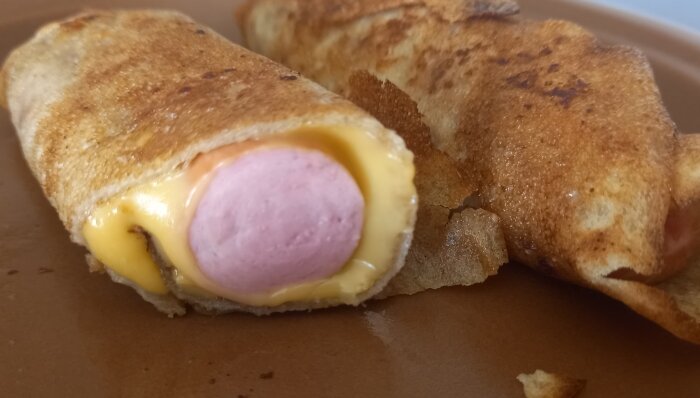 - сыр плавленный в пластинках (можно любой, даже твердый потереть, но готовые пластинки использовать удобнее) На блинчик кладем пластик сыра, сосиску (или половинку, если сосиски длинные)... ... сворачиваем в рулетик и обжариваем на сливочном маслице на сковороде по 2 минуты с каждой стороны Вкууууснооо... Улетают моментально Еще начинки для блинчиков/рулетиков из лаваша: