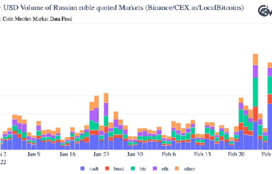 Чем более нестабильная ситуация в мире, тем больше внимания инвесторы уделяют биткойн и прочим криптовалютам. Люди все меньше доверяют фиату из-за высокого уровня инфляции во многих странах. В такой ситуации населению нужна альтернатива, которой в последнее время является биткойн и прочие цифровые активы. Котировки BTC первоначально рухнули после первых новостей о начале «спецоперации» России на территории Украины. Но менее чем за сутки BTC восстановил свои позиции и вырос до самого высокого уровня последних недель. Большинство других криптоактивов последовало за биткойн: изначально обрушившись, после чего перейдя на рост. Акции и другие классы активов также сначала обвалились, но затем 24-го числа восстановились, при этом такие акции, как Apple (AAPL) и Tesla (TSLA), держатся относительно хорошо. В целом, S&P 500 (SPY) за последнюю неделю двигался относительно синхронно с BTC. Но в понедельник, 28 февраля, BTC начал сепарацию, поднявшись примерно на 10% за день, в то время как S&P 50
