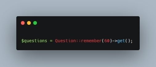 Большое количество запросов является тяжелым бременем для сайта, которое может привести к серьезному ухудшению производительности. К счастью Laravel предлагает простой механизм кеширования этих запросов, используя для этого лишь один вызов метода. Рассмотрим его на примере: Вызовем все questions из базы данных, но закэшируем запрос, чтобы минимизировать количество обновлений таблицы (смотри на картинке). Да-да, больше ничего не требуется. Все гениальное — просто! --- ➤➤ Изучите тему подробнее с наставником mentor-city.com ➤➤ Задавайте свои вопросы в комментариях ⬇️
