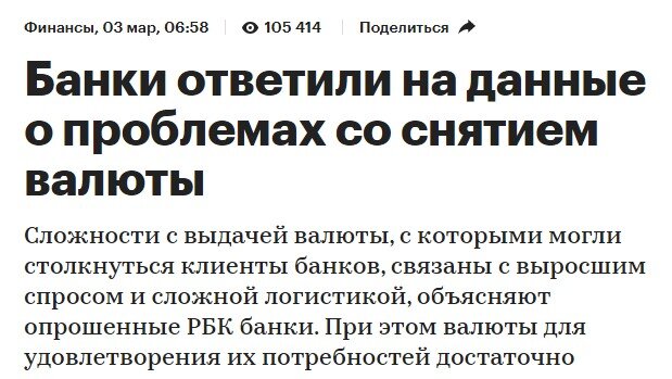 Многие клиенты банков столкнулись с трудностями при желании снять валюту со своих счетов. В частности, об этом сообщают пользователи портала Банки.ру, корреспонденты РБК. Например, клиенту Райффайзенбанка, обратившемуся за выдачей валюты со счета 1 марта, предложили оставить заявку на 14 марта, банк ВТБ не называет конкретных сроков, и сообщает, что не гарантирует выдачу евро, клиенту "Ак-Банка" предложили выдать сумму в рублях "по неадекватному курсу" и т.д. При этом сами банки, в основном, заявляют, что валюты для удовлетворения всех клиентских запросов у них достаточно, и сетуют на сложности с логистикой из-за возросшего спроса. Вместе с тем, 2 марта Евросоюз запретил продажу, поставку и экспорт банкнот евро в Россию. А российские банки, одновременно, начали в разы повышать ставки по валютным вкладам в стремлении привлечь как можно больше валюты на депозиты, в т.ч. и той, которую клиенты хотят снять со счетов. Ставки по валютным вкладам уже доходят до 8-10% годовых. При этом при взн