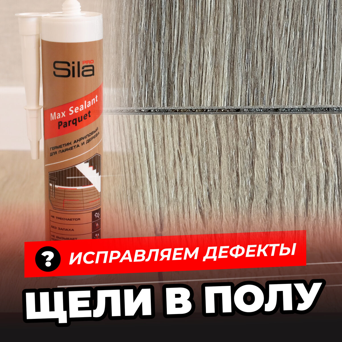 Со временем на паркетных полах образуется деформация покрытия, возникшая в процессе эксплуатации от перепада температур и влаги, неправильного ухода, механических повреждений. Например: Стыки между разными напольными покрытиями, технологический зазор при укладке, компенсационные зазоры, трещины и другие дефекты, возникшие в процессе эксплуатации при расширении ламината, паркета, пробкового пола можно заполнить при помощи паркетного герметика на акриловой основе Sila PRO Max Sealant PARQUET. Эластичный акриловый паркетный герметик Sila PRO Max Sealant PARQUET легко проникает в любые повреждения, поможет сделать аккуратный и незаметный стык, заполнить небольшие щели, отремонтировать дефекты деревянного покрытия. В ассортименте 7 цветов (ясень, сосна, орех, дуб, венге, бук, махагон) под самые актуальные оттенки пола, после высыхания герметик можно окрашивать, шлифовать, покрывать лаком. Посмотрите видео про паркетный акриловый герметик Sila PRO Max Sealant PARQUET и узнайте, как устранить