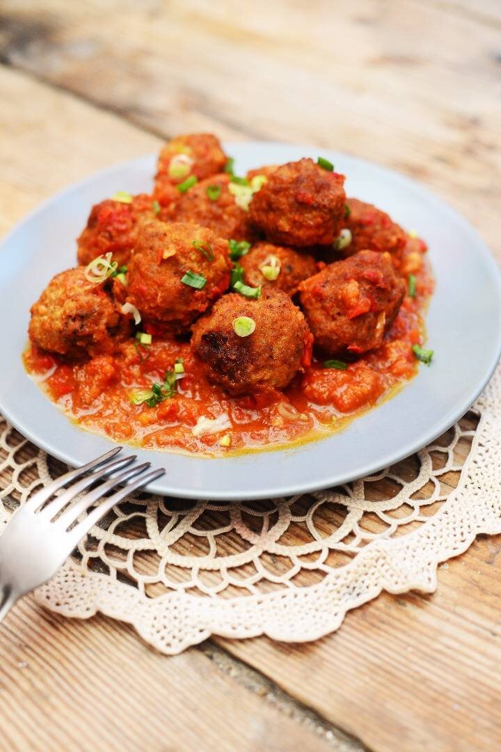 Ингредиенты: Фарш свинний (краще мішаний), цибуля, Яйце, панірувальні сухарі, Соус:, болгарський перець, помідори, протерті томати, Часник, Зелень (кріп, петрушка), олія для смаження