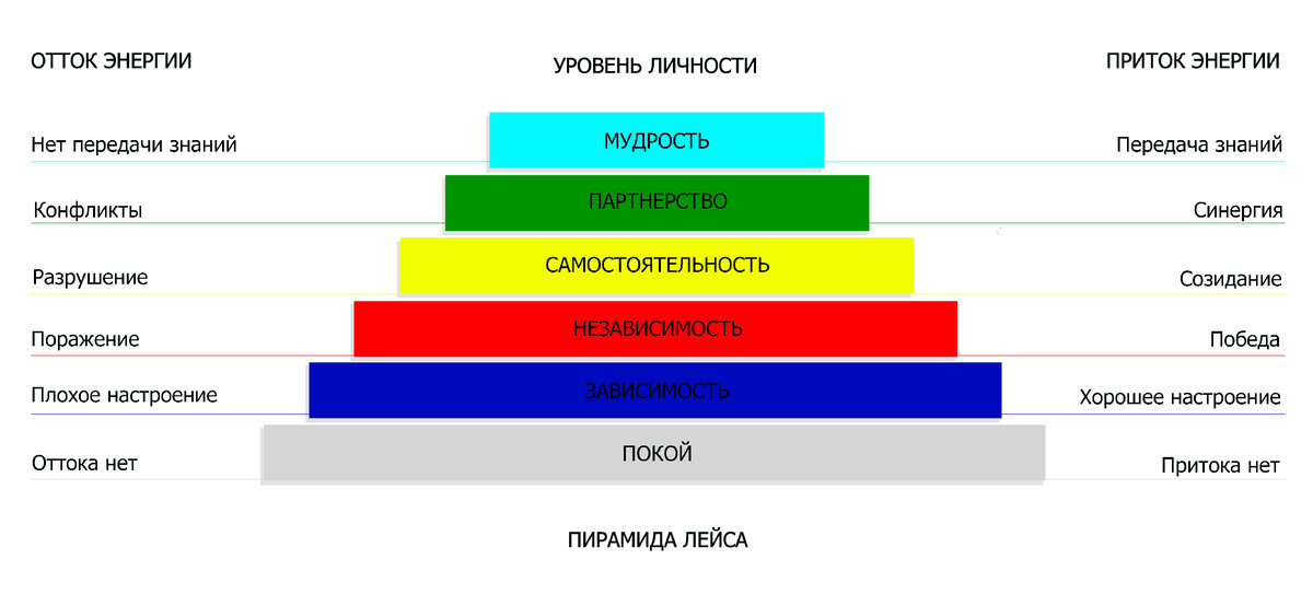 В тот или иной период жизни у каждого человека есть свои источники энергии, которые тесно связаны с уровнем развития личности. Согласно концепции пирамиды Лейса, таких уровней шесть: покой, зависимость, независимость, самостоятельность, партнерство, мудрость.