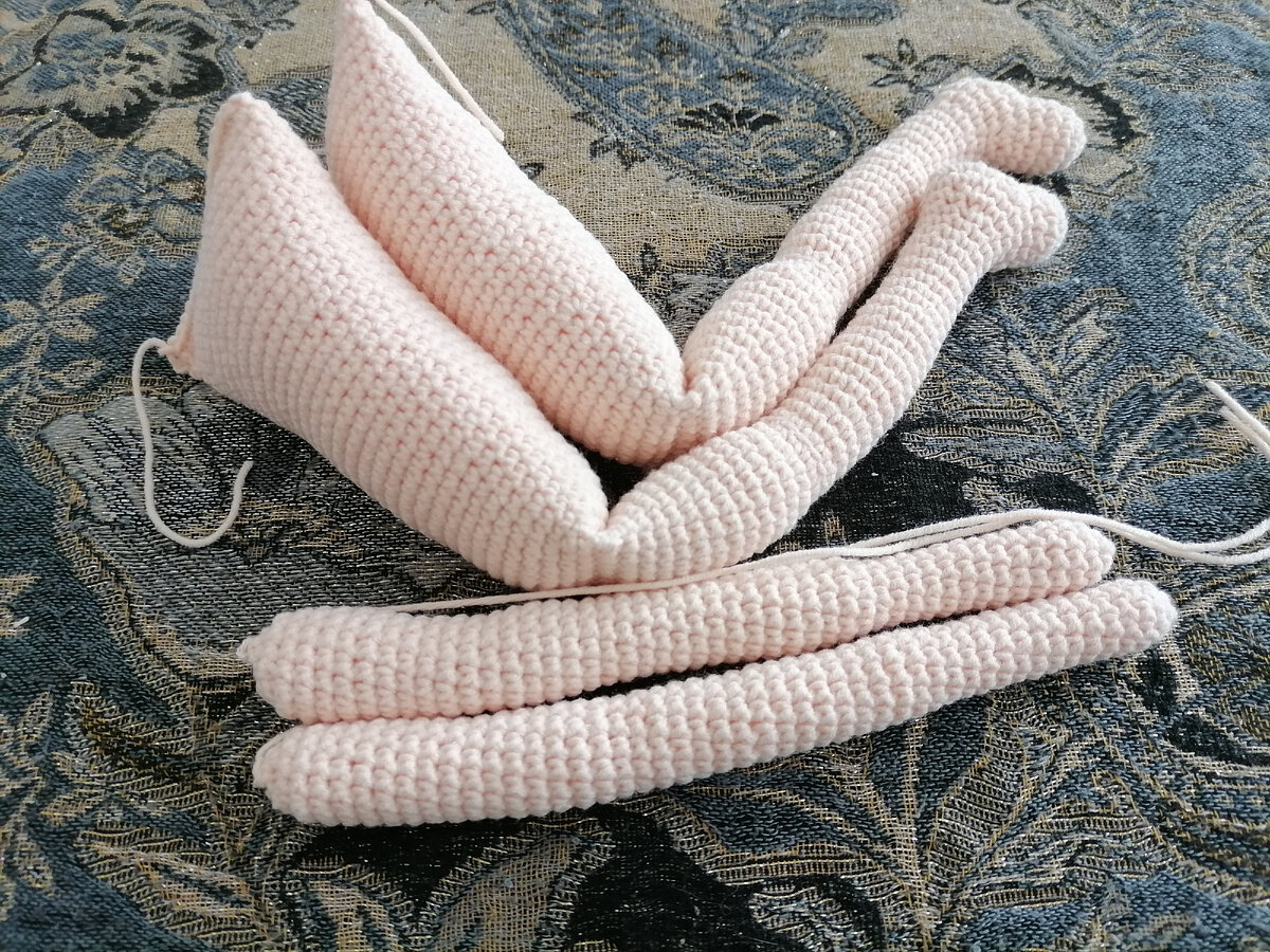 Все детали для Тильды готовы. Пришиваю крючком к туловищу нижние и верхние конечности. Инструкция: как сшить связанную куклу Хвостики у ног закрепляю и прячу внутрь деталей. У рук оставляю длинные нити. Такие хвостики нужны для пришивания деталей. Туловище наполняю холлофайбером. Определяю перед и спинку у куклы. Игрушки крючком вяжут по спирали. Начало ряда смещается вправо. На полотне остается дефект - отчетливая кривая линия. Сторону со смещённым петлями я считаю спинкой. Правда, есть способ корректировки дефекта. В начале ряда надо смещать марке влево (начало ряда при этом выравнивается). Делая туловище я не выполняю смещение петель. Начало ряда я обязательно выравниваю, при вывязывании рук и ног. На ногах при ровной линии начала легче формировать область коленей и сшивать конечности вверху по линии бёдер. Определяю лицевую и заднюю часть ног. В области коленей с лицевой стороны проложена красивая косичка (с задней стороны стежок похож на пунктир). Туловище внизу складываю та