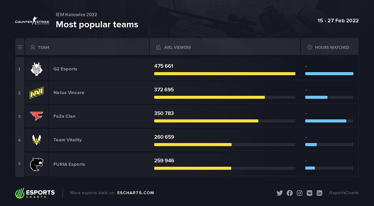 Согласно данным Esports Charts, NAVI заняли второе место в списке самых популярных команд IEM Katowice 2022 по среднему количеству зрителей. Статистика не учитывала данные китайских платформ. В среднем за матчами команды следило 372,6 тысячи человек. NAVI по этому показателю обогнал только финалист турнира – G2 Esports. За командой в среднем наблюдало 475,1 тысяч геймеров. Faze Clan, Team Vitality и FURIA вошли в топ-5 популярных клубов IEM Katowice. IEM Katowice 2022 прошел с 15 по 27 февраля, чемпионом турнира стала FaZe Clan, которая обыграла G2 в гранд-финале со счетом 3:0.