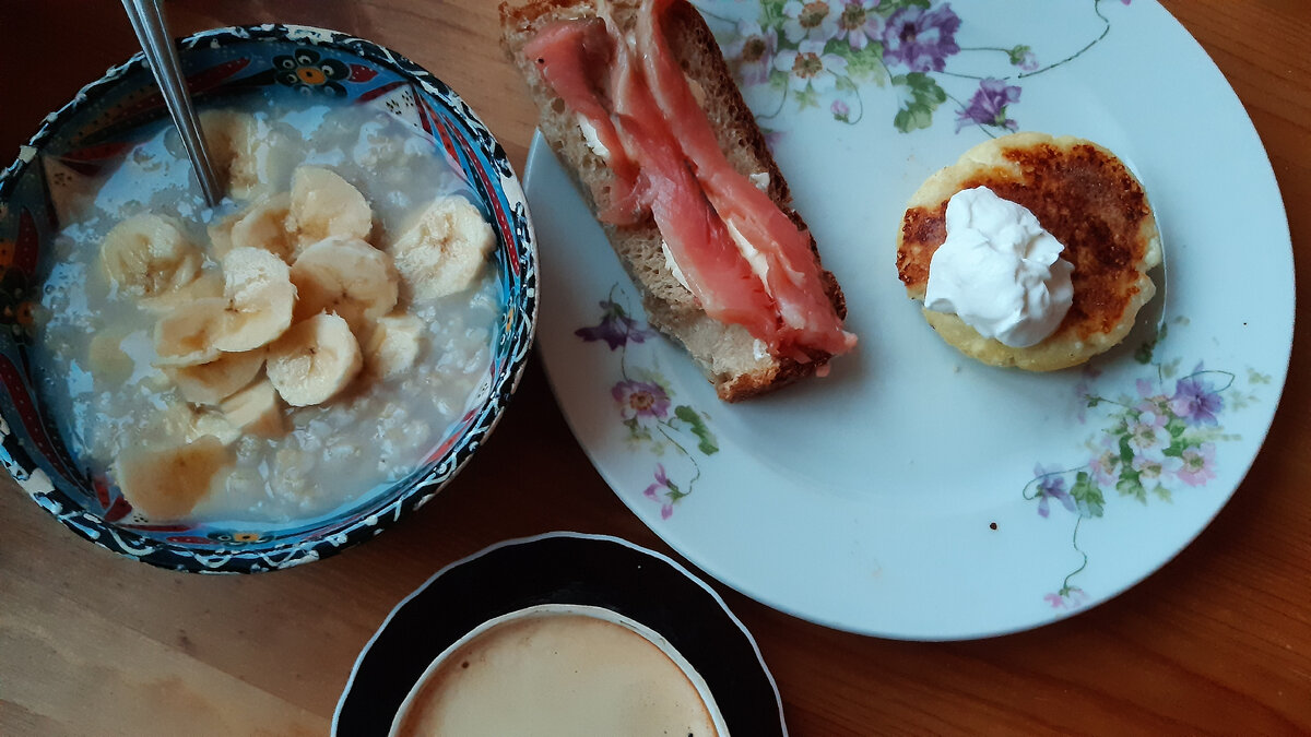 завтраком сегодняшним я вас не удивлю: все то же самое, что вчера - каша овсяная с бананом и арахисовой пастой, сырники, бутерброды с горбушей, кофе