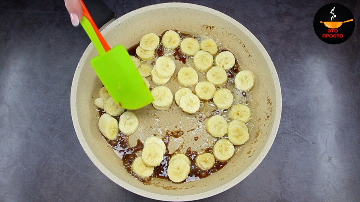 Я за то, чтобы готовить разнообразные блюда, но они в тоже время должны быть простыми, из доступных ингредиентов и, конечно же, вкусными. У меня в семье трое мужчин, ох, как нелегко им угодить с едой! Но этот пирог пришёлся по вкусу каждому, поэтому с удовольствием делюсь рецептом и надеюсь в вашей семье такой вариант тоже приживётся. СПОСОБ ПРИГОТОВЛЕНИЯ: В сковороду кладём маленький кусочек сливочного масла, растапливаем его, добавляем 1-2 ст.л. сахара (зависит от вашего вкуса) и помешивая, растворяем сахар полностью. Затем кладём сюда 2 банана, нарезанные на кружочки и жарим их с двух сторон 5 минут. Даём остыть. А тем временем замешиваем тесто. В миску разбиваем 1 яйцо, добавляем 40 г сахара и щепотку ванилина, хорошо размешиваем венчиком. Выливаем 6 ст.л. растительного масла без запаха, снова перемешиваем и добавляем сухие ингредиенты - 5 г разрыхлителя и 180 г муки. В итоге у нас получается мягкое, очень нежное тесто. Отрезаем 1/3 часть теста, заворачиваем в пакет и кладём в моро