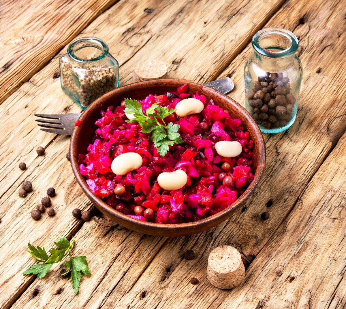 Винегрет – один из любимых салатов моей семьи. Вроде и незатейливо, а всегда вкусно, красиво и аппетитно. Как говорится, и на праздничный стол можно подать, и на обед или ужин приготовить, ведь блюдо самодостаточное. Кроме того, винегрет – полезное блюдо в первую очередь потому, что все овощи варятся в кожуре, а значит сохраняют максимум витаминов и микроэлементов. Например, возьмем свеклу – главную составляющую винегрета. Оказывается, этот овощ может заменить многие лекарства. Отварная свекла понижает давление, укрепляет нервы, сохраняет зрение у пожилых людей, даже защищает от рака! Картофель, сваренный в кожуре, содержит много калия, который очень необходим сердечникам и гипертоникам. Кроме того, в этом овоще есть витамин С. Квашеная капуста – прекрасный натуральный лекарь. Она может улучшить состояние здоровья. Квашеная капуста поможет при стрессах, укрепит сердце, активизирует обмен веществ, ну а главное – содержание большого количества аскорбиновой кислоты, то есть витамина С, к