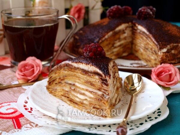 Торт или десерт "Тирамису" очень популярен. Однако для его приготовления требуются не самые дешёвые продукты. Так и появилась русская версия торта "Тирамису" из блинов - как говорится, голь на выдумки хитра. В качестве крема вместо маскарпоне, возьмём более доступный и привычный продукт - сметану. Одни из самых вкусных тортов приготовлены именно со сметанным кремом. Блины для этого торта вы можете готовить по своему любимому рецепту. Однако на всякий случай покажу один из способов их приготовления😉 Чем большее количество блинов вы будете использовать, тем выше ваш торт получится. Тонкие блины на кефире 📖 ИНГРЕДИЕНТЫ: 📄 ПРОЦЕСС ПРИГОТОВЛЕНИЯ Взбейте в миске яйца с сахаром, солью и содой. Всыпьте муку и размешайте так, чтобы не было комочков. Затем влейте кефир и замесите тесто. Количество муки может немного варьироваться. Оставьте тесто на 20 минут, а затем приступайте к жарке. Посмотреть полный пошаговый рецепт с фото >> Блины испекли, теперь можно переходить к приготовлению торта.