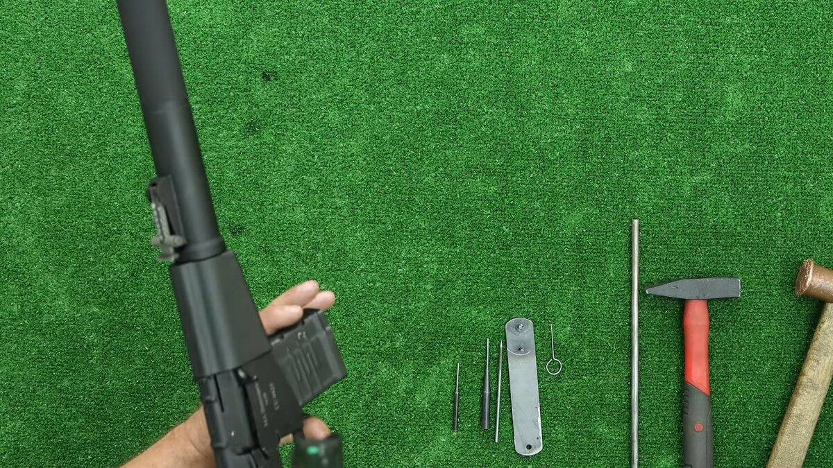 Рады видеть вас на канале Молот АРМЗ. Сегодня продемонстрируем вам полную разборку и сборку карабина МА-Винторез производства компании Молот АРМЗ в текстовом виде. Данное видео вы можете увидеть по ссылке. Итак, приступим: - Отстегиваем магазин - Проверяем отсутствие патрона в патроннике, производим контрольный спуск. - Снимаем крышку ствольной коробки путём нажатия клавиши в отверстии крышки ствольной коробки в задней ее части. - Извлекаем возвратную и боевую пружину. - Отводим затворную раму в заднее положение и возвращаем ее вперед тем самым освобождая ударник из затвора и вынимаем ударник доведя его до крайнего заднего положения по направляющим. Устанавливаем раму в крайнее заднее положения тем самым освобождая ее из направляющих и вынимаем ее. Теперь для удобства можно отстегнуть приклад. - Берем ключ, идущий в комплекте с каждым карабином, и откручиваем гайку, центрующую ствол. - Нажимаем фиксатор в передней части цевья и скручиваем кожух ствола. - Не отпуская фиксатора снимаем
