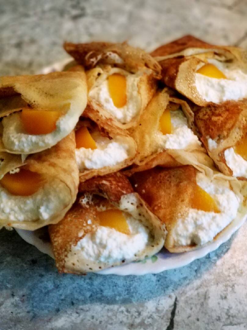 Блины «Безупречные» Ещё больше рецептов в шкатулке у @_svetochka_belyaeva #СветочкаБеляева #светочкины_рецепты #блины #блинчикистворогом #блинчикирецепт #блинчикисначинкой Ингредиенты: кипятка , яйца, сахарного песка (сластёнам побольше), Соль, Ванилин, молока, мука, подсолнечного масла, творога, сметаны, Персики по желанию Способ приготовления: Взбейте 3 яйца с 1,5 ст.л сахара, добавьте соль и ваниль. Далее взбивая смесь, добавляем кипяток❗, затем холодное❗ молоко и продолжая взбивать постепенно всыпаем муку. Не переставая взбивать, вливаем 3 ст.л подсолнечного масла. Тесто отставляем минут на десять, чтобы все ингредиенты гармонично смешались. А затем начинаем выпекать. На разогретую сковороду тонким слоем выливаем тесто, ждем 1–2 минуты (с поверхности блина уходит влага), а затем переворачиваем. К слову, если сковорода не специальная, тогда следует перед выпеканием налить на нее чуть-чуть растительного масла, которое нужно распределить по поверхности. Готовим начинку. Хорошо растира