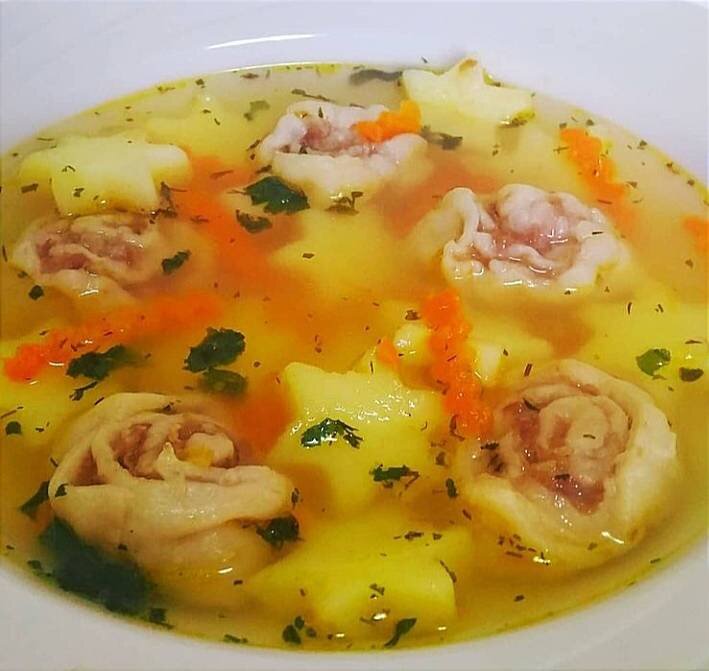 При лепке домашних пельменей, небольшое количество теста и фарша я отделяю для приготовления рулетиков. И замораживаю их. При необходимости можно быстро сварить вкусный супчик с "ленивцами" 📌Пельменное тесто раскатать в тонкий прямоугольный пласт( 25×10) размазать по всей поверхности фарш, завернуть рулетом и нарезать на небольшие кусочки. Ингредиенты: - ленивые пельмени, - морковь небольшая, - лук репчатый небольшой, картофель, Соль, перец чёрный молотый , Паприка , растительное масло, зелени укропа и петрушки Способ приготовления: Нарезать картофель и забросить в кипящую подсоленную воду или бульон. Морковь мелкой соломкой и лук мелким кубиком обжарить на растительном масле. Добавить к картошке. Варить минут 10-15, затем добавить в суп ленивые пельмени, лавровый листик, чёрный молотый перец, можно добавить паприку. И в конце добавить измельченную зелень. Варить минут 10 до готовности ленивцев. Вкусный супчик готов😋 Приятного аппетита🌹