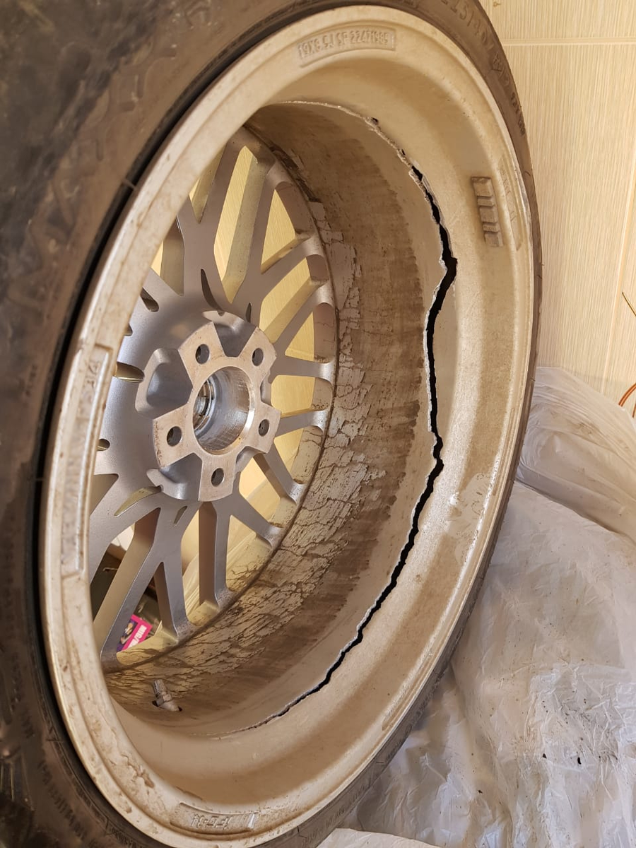 Ну так вот. Привезли мы значит эти диски и начали продавать. Дизайны стильные, цена низкая и, естественно, они начали разлетаться ооочень быстро. И вот тут началось самое интересное, от чего даже сейчас я в шоке. Нам посыпались звонки от клиентов, мол, ребят, продайте 1 диск, продайте 2 диска, один человек купил сразу запасной комплект, пока он был в наличии, еще один пожаловался на постоянные замятия и апогеем всего этого трэша стала фотка от клиента, на которой видно, что диск просто раскололся вдоль обода! Автомобиль - Mercedes С-class. Очень легкий! Не Крузак, не Тахо, а всего лишь Ц-шка!! Самое "забавное", что диски гнулись практически на ровном месте. Один клиент ехал с Питера в Москву по ровному платнику, где ям нет в принципе, другой передвигался только по Москве, тут дороги хорошие и тд.