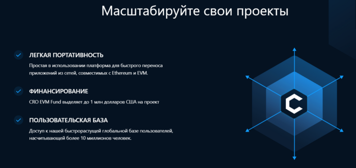 Cronos — это сеть EVM, которая работает параллельно с сетью Crypto.org. Она нацелена на массовое масштабирование экосистемы DeFi, предоставляя разработчикам возможность быстро переносить приложения из Ethereum и EVM-совместимых сетей, с финансированием из фонда EVM Particle в размере 100 млн долларов и доступом к базе пользователей экосистемы Crypto.com, насчитывающей более 10 млн человек. Вы можете отправлять, получать и управлять своими токенами CRO в сети EVM Cronos, Crypto.org и в приложении DeFi Wallet. Если говорить более кратко и понятно, то основные преимущества, которые предлагает новая сеть это: Построен на Ethermint, который поддерживает быстрое портирование приложений и смарт-контрактов из Ethereum и других цепочек, совместимых с EVM. Cronos может обрабатывать больше транзакций в минуту, чем Ethereum, что делает выполнение смарт-контрактов быстрее, дешевле и экологичнее. Протокол Inter Blockchain Communications (IBC) обеспечивает взаимодействие и соединение с цепочкой Crypt