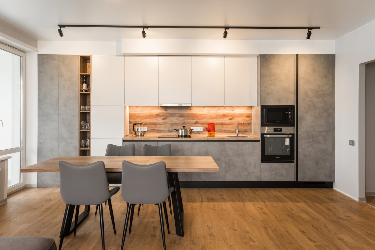 Можно встретить много советов по планировке маленькой кухни, оно и понятно, разместить все необходимое в небольшом пространстве достаточно проблематично. Но значит ли это, что с планировкой большой кухни проблем не возникает? Важно подобрать наилучший вариант планировки, который органомично впишется в вашу кухню и позволит рационально использовать место на кухне. Если в маленькой кухне все буквально под рукой, большая территория сулит разбросом рабочего пространства, а значит ва придется тратить больше времени при для выполнения стандартных процедур, а значит и больше уставать. Двухрядная планировка. Подобная планировка используется в проходном помещении, в кухнях-гостиных. Параллельная расстановка позволяет установить рабочий треугольник, и разместить все необходимое в пределах вытянутой руки. Линейная планировка. Обстановка "линейкой" не часто используется в больших помещениях. Обустройство рабочего треугольника сложно в его воплощении, в виду того, что кухонный гарнитур вытянутый