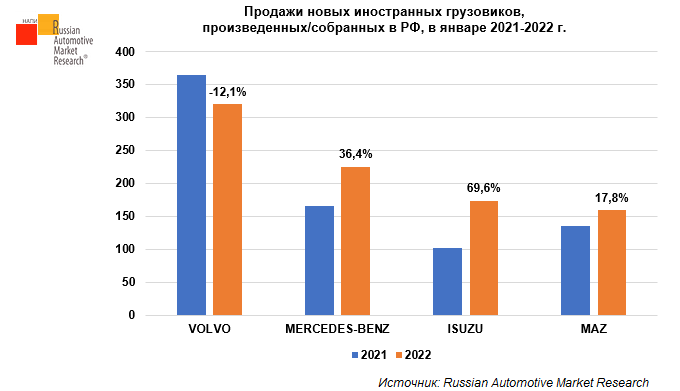Агентство Russian Automotive Market Research проанализировало продажи новых грузовых автомобилей в январе 2022 года. В январе 2022 г. продажи новых грузовиков в России составили 6,4 тыс. ед., что на 23,7% больше результата января прошлого года. В январе 2021 г. было продано 5,1 тыс. ед.. На долю иностранных грузовиков, произведенных/собранных на территории России, пришлась четверть от всего объема продаж новых грузовых автомобилей в январе 2022 г. и в январе 2021 г. (25,1% и 25,4% соответственно). Среди представленных на графике иностранных грузовиков, произведенных/собранных на территории России, лидером по приросту в январе 2022 г. становится ISUZU (+69,6%). Продажи грузовой техники VOLVO в январе текущего года сократились на 12,1% по отношению к предыдущему году. https://napinfo.ru/infographics/kakova-dolya-inostrannyh-gruzovikov-proizvodimyh-v-rossii/