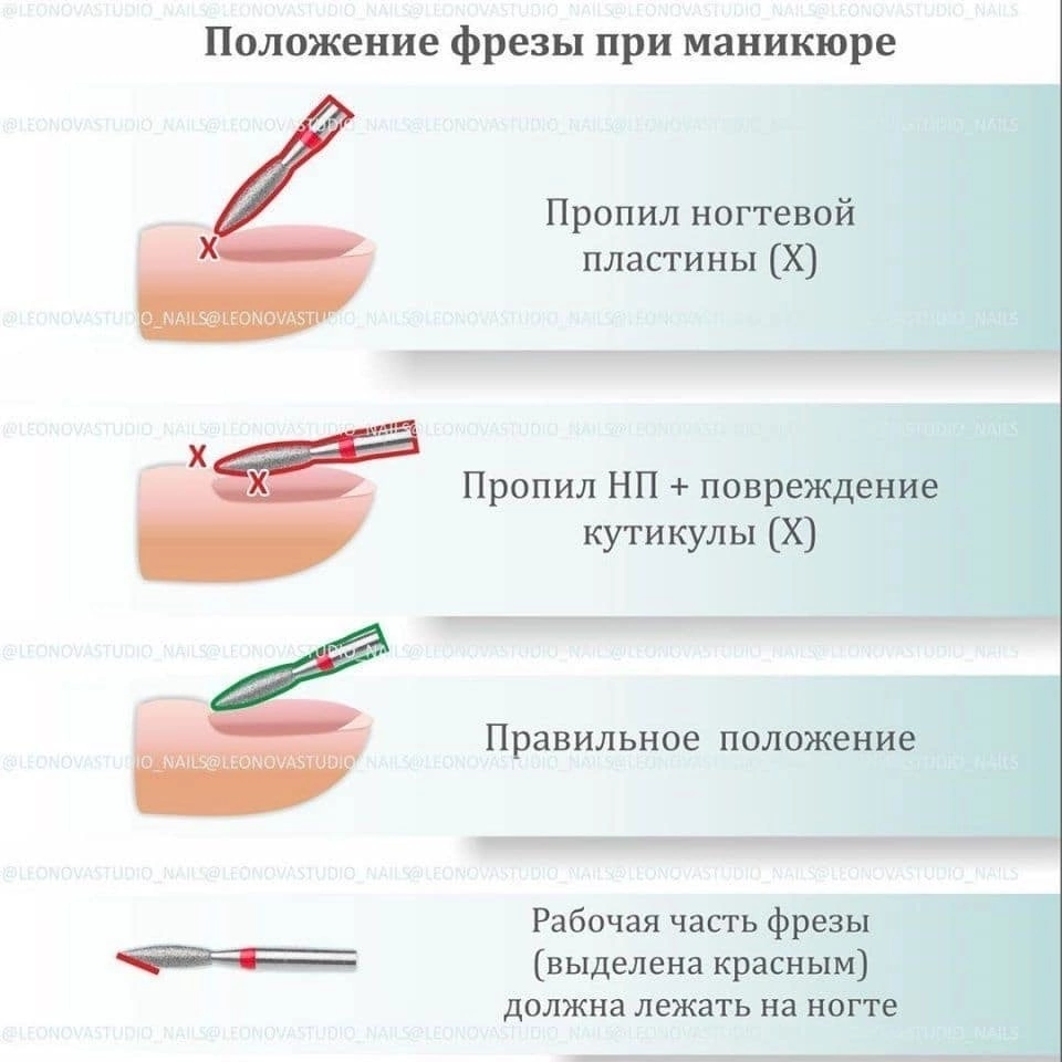У каждой фрезы есть рабочая часть, но у всех она выглядит по-разному. У фрезы различают: - Носик Если носиком начать зачищать птеригий, то мы можем повредить кутикулу! Носиком можно и нужно зачищать пазухи. - Щечка Это та часть фрезы, которой мы убираем птеригий РАБОЧАЯ ЧАСТЬ ИДЁТ В ПАРАЛЛЕЛЬ С НОГТЕВОЙ ПЛАСТИНОЙ Если ставить фрезу по-другому, будет либо пропил, либо ранка - Пузико Пузиком, мы в основном работаем по боковым валикам, также можно работать и по заднему валику. Если убирать птеригий пузиком - можно сделать пропил.