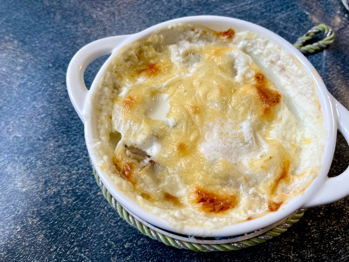 131 ккал на 100 грамм. Почти без углеводов Привет, привет 👋 всем!!! Сегодня хочу рассказать о ещё одном простейшем рецепте приготовления рыбы. Идеально для тех, кто не хочет долго стоять у плиты. Всего пару минут на подготовку и остальная работа на духовке) Худеющим это блюдо также подойдёт. В одной порции у меня получилось 260 ккал, но это очень сытно. Я еле всё съела. И это при том, что я использовала обычные продукты. Если взять ингредиенты менее калорийные, то и общая калорийность снизится. Итак, нужна рыба. В принципе, любая. Но желательно всё-таки использовать либо филе, либо малокостную рыбу. У меня филе минтая. Я его нарезала на кусочки со стороной ~2 см. Укладываю рыбное филе в посуду для запекания. Формы ничем не смазывала. Я решила сделать порционно, поэтому использовала небольшие керамические формы. Если ваша рыба со шкуркой, то кладём шкуркой вниз. Рыбу я слегка подсолила. Совсем чуть-чуть, потому что буду использовать сыр. При желании, рыбу можно поперчить и доба
