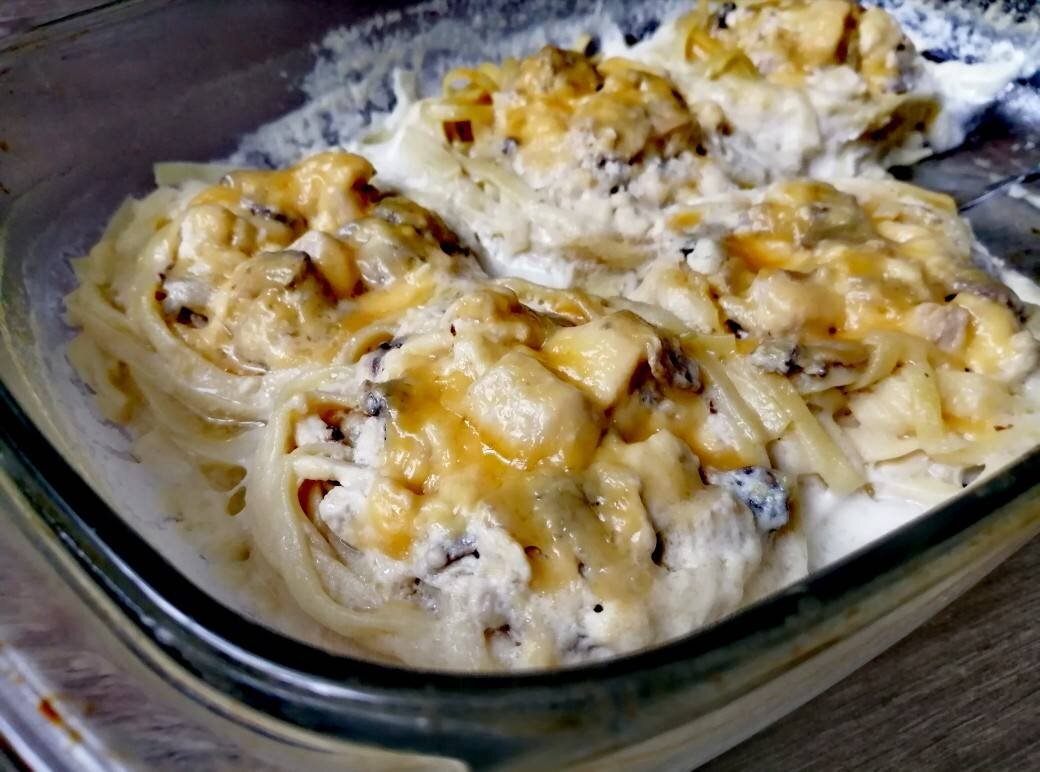 #фаршированныегнезда #ужин #макароныгнезда #гнездасфаршем #жюльен #гнездасжульеном #гнездавдуховке #гнездасначинкой #легкиерецепты #жюльен #вкусныйужин #макаронысжульеном Ингредиенты: куриной грудки (400 гр), луковица, шампиньонов, ст.л растительное масло, сливок, гр сыра, Макароны "Гнезда", ст.л сметаны, ст.л майонеза, воды, По вкусу соль и перец, Сливочное масло для смазывания формы Способ приготовления: Форму смазать сливочным маслом. Переложить "гнезда" в форму для запекания. Лук нарезать мелким кубиком. На разогретой сковороде обжарить лук. Куриное филе нарезать кубиками и обжарить вместе с луком. Грибы нарезать ломтиками и в отдельной сковороде обжарить на растительном масле, пока выпарится вся жидкость. Все соединить в одну сковороду и перемешать. Добавить сливки, половину тёртого сыра, соль, перец. Перемешать и тушить несколько минут. Середину "гнезд" заполнить жульеном. Смешать сметану и майонез, добавить воду, посолить, поперчить. Перемешать. Влить в форму к "гнездам". Сверху