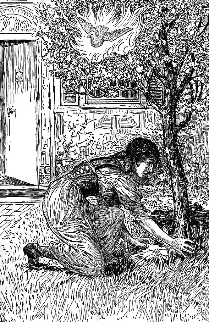 И начал можжевельник покачиваться, стали ветки на нем то раздвигаться, то опять сходиться, будто кто радовался и размахивал рукой. И спустилось в это время с дерева облако, и в облаке будто пламя вспыхнуло. Вылетела из пламени красивая птица и так прекрасно запела, взлетела высоко-высоко на воздух, а когда она улетела, стал можжевельник такой же, как был прежде, а платок с костями исчез.