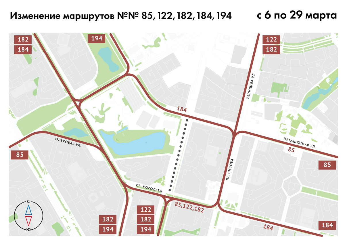 С 6 по 29 марта изменятся маршурты автобусов №№ 85, 122, 182, 184, 194 из-за закрытия движения по улице Маршала Новикова у Парашютной улицы.