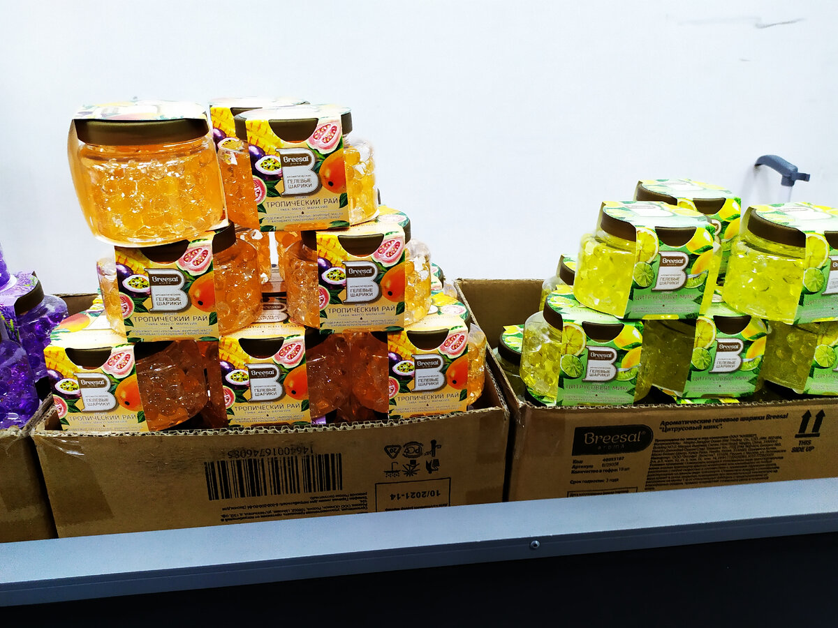 Ароматические гелевые шарики с ароматом цитрусовых, тропиков и лаванды. Применяется, как освежитель воздуха в комнате, шкафу или в автомобиле. В баночке массой 160 грамм. Цена 90 рублей.