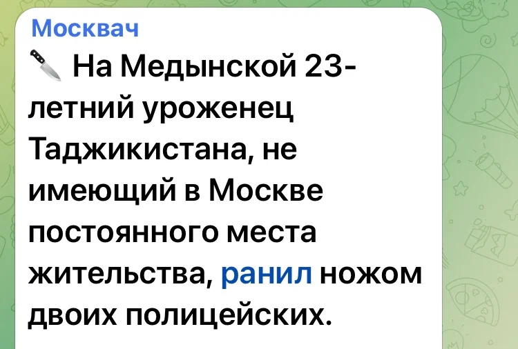 Кроме криминальных элементов в Россию под личиной трудовых мигрантов, пользуясь безвизовым соглашением с азиатскими странами, приехало огромное количество исламских экстремистов- игиловцев. Эти бойцы не работают, тренируются в закрытых национальных бойцовских клубах, собираются на сходки в молельных домах и ждут сигнала начала бесчинств в нашей стране.