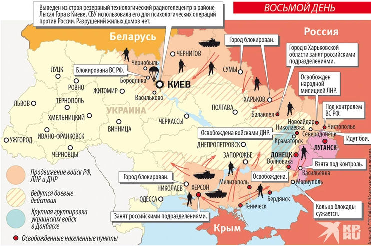 События на Украине. Последние новости на Украине. События развиваются критически быстро, но главное внимание приковано к боям за Киев, а также Харьков и юг Украины. Официальная позиция Российской власти заключается в том, что уже есть незначительные потери среди вооруженных сил, как в технике, так и среди личного состава, но они не сопоставимы с потерями отрядов националистов и вооруженных сил Украины. Ожесточенные бои за оцепленные Киев и Харьков . По некоторым данным, Херсон и множество небольших городов, что находятся на юге Украины взяты под контроль войск РФ. Официальные власти Украины говорят приблизительно тоже, но при этом добавляют, что местный жители «с голыми рыками» бросаются на колоны русской военной техники. А мэры многих городов Украины просили о зеленом коридоре для гражданского населения, которое осталось не только без воды, тепла и света, но и без еды. Официальная власть Киева требует всё больше помощи для Украины не только в военной технике, но и в денежном экв