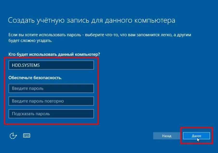 В следующем диалоге введите пароль для данной учетной записи, а затем продублируйте его в поле «Подтверждение» и установите нужные флажки, после чего нажмите на кнопку «Далее».