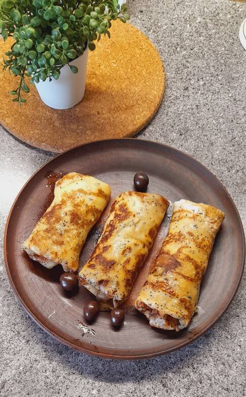 #масленица Нашла очень интересную начинку для блинчиков. Особенно оценят такие блинчики дети. Ингредиенты: Яйца, Сахар , Соль, Молоко, Растительное масло , Сливочное масло , Мука, Начинка, Шоколад, Мягкий творог, Джем апельсиновый, лимонный или др (н-р джем "Махеев") Способ приготовления: Муку всыпаем в миску, добавляем соль и сахар. Добавляем яйца, молоко и перемешиваем миксером до однородности. Растопите сливочное масло, слегка остудите и замешайте в тесто. Уберите тесто на 15 минут в холодильник. Хорошо разогреваем сковороду и слегка смазываем растительным маслом. Наливаем тесто и выпекаем золотистые блинчики на среднем огне по 1 минуте с каждой стороны. Готовые блинчики складываем стойкой на тарелку, промазывая сливочным маслом. Делаем начинку. В миску кладём мягкий творог, разминаем вилкой. Измельчаем шоколад (можно использовать любой шоколад: шоколадная плитка, диски, капли, стружка) и добавляем к творогу. Теперь добавляем джем (у меня был лимонный, можно взять любой на ваш вкус,
