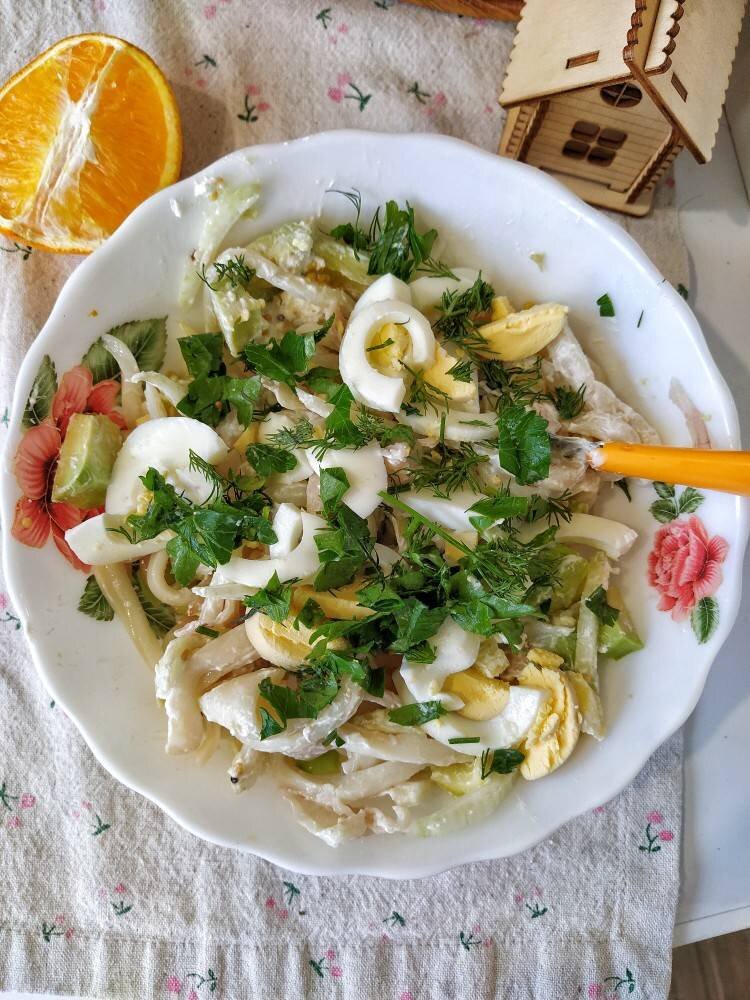 Вкусный белковый салатик, которые порадует Вас на любой праздник или просто на ужин #8марта Ингредиенты: кальмаров, яйца, авокадо, сельдерея, Соль, перец, приправы , Творожный сыр из кефира для заправки, французской горчицы, зелени Способ приготовления: Кальмары чистим, готовим на пару или отвариваем. Режем кольцами. Яйца варим в крутую. Авокадо чистим, режем кубиком, сельдерей моем, режем соломкой. Смешиваем кальмары, авокадо и сельдерей. Заправляем творожным сыром и горчицей. Яйца чистим, режем полукружочками. Зелень моем, мелко режем. Выкладываем на салат. Подаём к столу. Приятного аппетита)