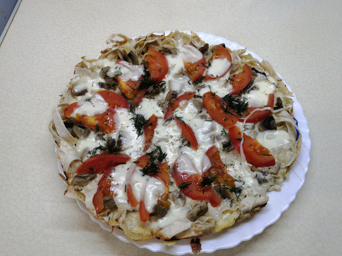 Это почти пицца из лаваша, почти, потому что с тестом не надо возиться, зато быстро