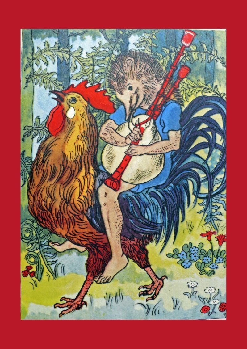 А Ганс-Еж тем временем пас ослов и свиней, был весел и сидел на дереве, играя на своей волынке. И случилось, что на ту пору проезжал мимо другой король вместе со своими слугами и скороходами. Он заблудился в лесу и не знал, как ему назад домой воротиться, а лес был большой и дремучий. Услыхал он издали прекрасную музыку и спрашивает у своего скорохода, что бы это могло значить, и велел узнать, в чем тут дело. Подошел скороход к дереву, посмотрел, поглядел, видит — сидит на верхушке петушок, а Ганс-Еж на него верхом уселся. И спрашивает его скороход, что он там наверху делает.