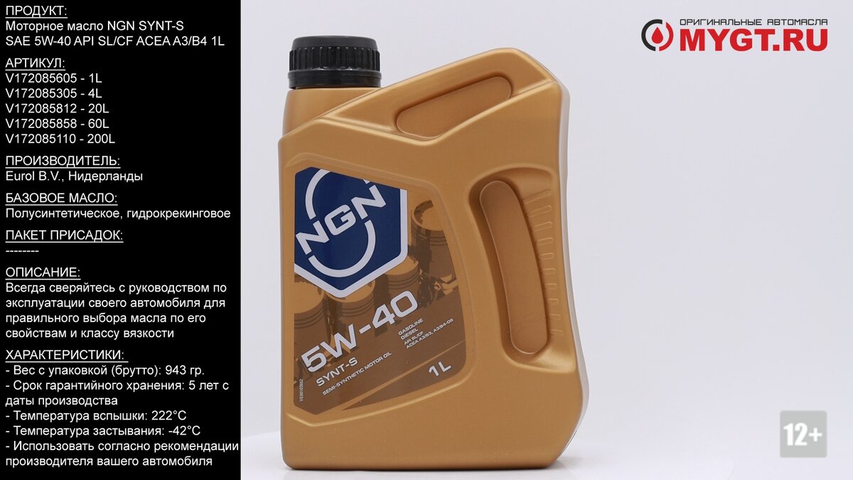 Моторное масло NGN SYNT-S SAE 5W-40 API SL/CF ACEA A3/B4 1L V172085605 #ANTON_MYGT